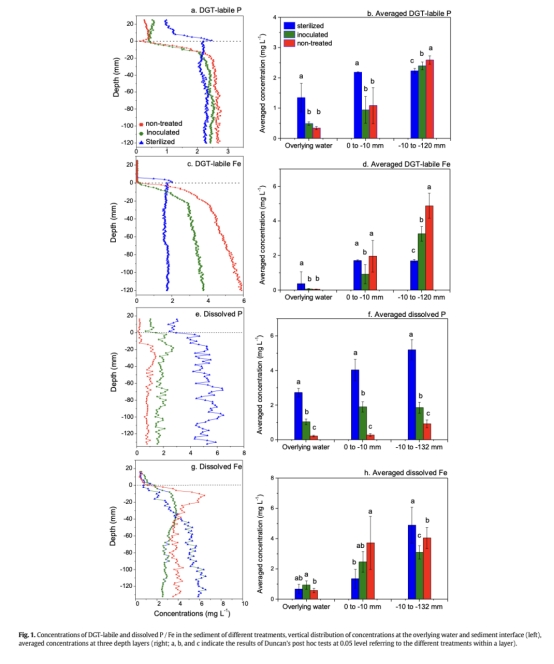 微生物對磷滯留的關鍵作用:滅菌顯著降低沉積物固磷能力(DGT-labile P在0-10mm層升高,圖1a-b),而接種微生物可部分恢復該能力。