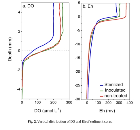 數據顯示自然組和接種組Eh(+100至+200 mV)顯著高于滅菌組(-50至0 mV),DO滲透深度更深(自然組3.8mm vs 滅菌組2mm)。
