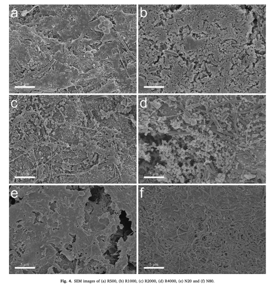 數據:小電阻/高吹掃組(R500/N80)生物膜平整致密(CLSM顯示連續結構,SEM顯示緊密微生物-EPS復合體);大電阻/低吹掃組(R4000/N20)生物膜多孔疏松。