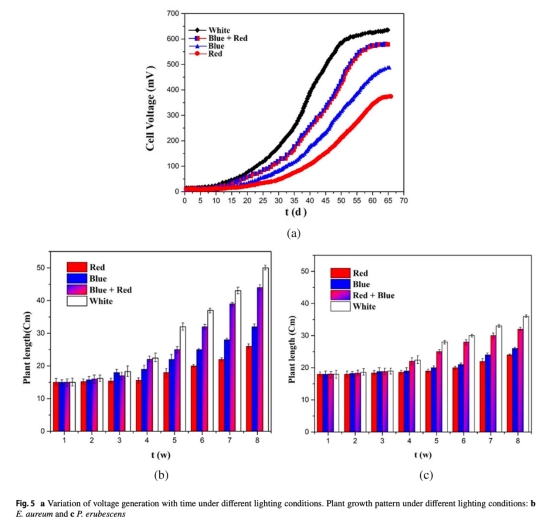 數據:窄底三室PMFC功率密度31.40 mW/m2,較雙室提升39.6%;白光下紅掌PMFC功率26.42 mW/m2,較紅光高72%。