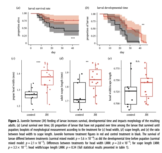 發育依賴性:JH顯著提高幼蟲存活率,表明C. floridanus幼蟲可能依賴工蟻傳遞的JH完成發育。