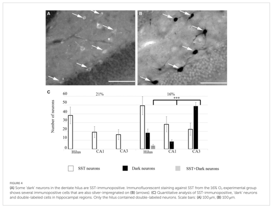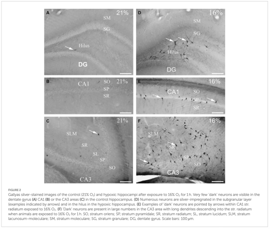 結(jié)構(gòu)損傷:Gallyas銀染法顯示缺氧導(dǎo)致海馬門區(qū)(hilus)生長抑素(SST)陽性抑制性神經(jīng)元出現(xiàn)“暗神經(jīng)元”(退化早期標(biāo)志),CA3區(qū)損傷最顯著(圖2-3)。