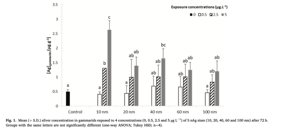研究通過自然環境水體暴露實驗(72小時),評估了5種粒徑(10–100 nm)、低濃度(≤5 μg/L)的銀納米顆粒(nAg)對淡水甲殼類Gammarus roeseli的生態生理學影響。結果表明: