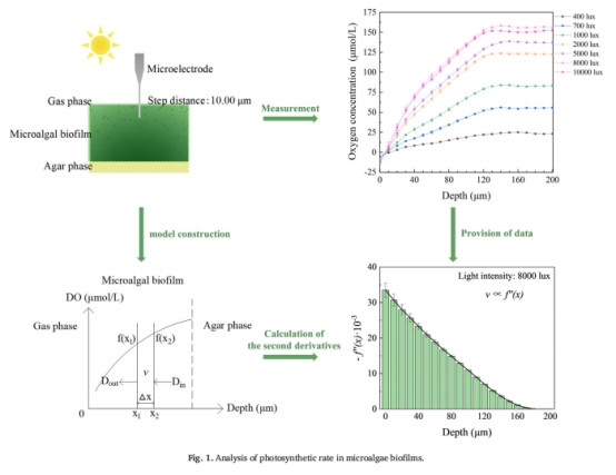首創(chuàng)量化方法:基于溶解氧(DO)微電極測量氧濃度梯度 f(x),構(gòu)建模型 v=?k?f′′(x) 量化生物膜不同深度的凈光合速率(圖1,公式3-2)。