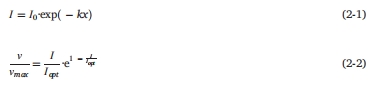 光衰減差異:生物膜內(nèi)光合速率呈線性衰減(圖2),而懸浮系統(tǒng)為指數(shù)衰減(公式2-1, 2-2),因生物膜空隙含氣態(tài)氧,光傳輸效率更高。