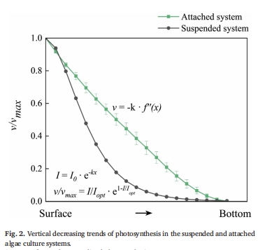 光合速率垂直分布 圖2 附著系統(tǒng)線性衰減(斜率-0.15)vs.懸浮系統(tǒng)指數(shù)衰減(k=0.25 m?1),證明生物膜光利用更高效。
