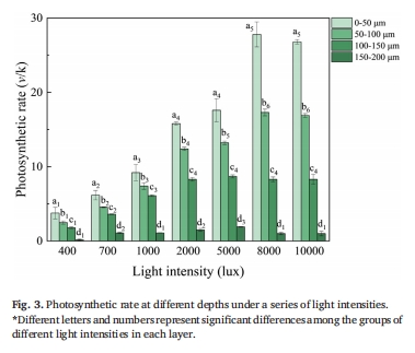 深層光合潛力:150–200 μm深處光合速率僅為表層的3.60–17.86%,但5000 lx強(qiáng)光下可提升389–956%(圖3)。