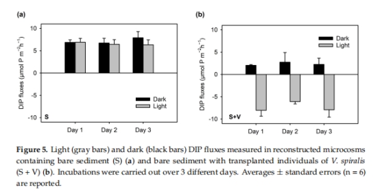 種植苦草的沉積物(S+V)在光照下成為 DIP(溶解性無機(jī)磷)的匯(吸收7.3±1.7 μmol m?2 h?1),而裸露沉積物(S)始終是DIP源(釋放7.5±1.0 μmol m?2 h?1)(圖5)。