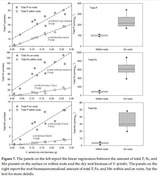 根系表面形成 鐵錳斑塊(plaques),固定P、Fe、Mn的量分別達(dá)215 μmol gdw?1、617 μmol gdw?1、30.2 μmol gdw?1,遠(yuǎn)超根系內(nèi)部含量(圖7)。