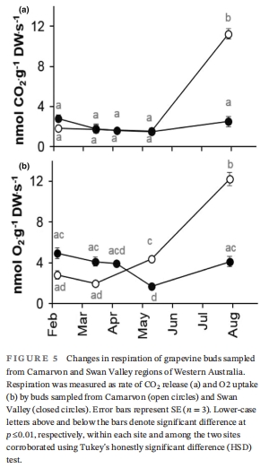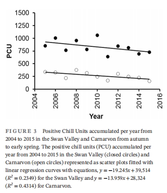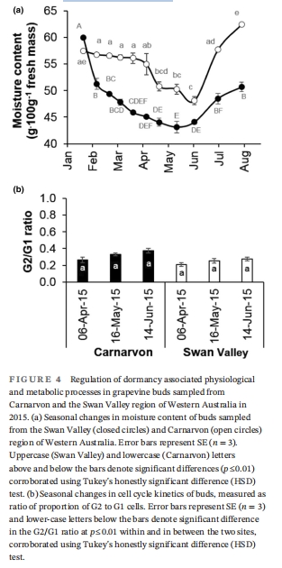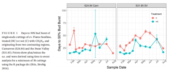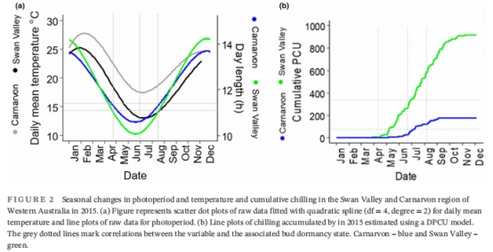 論文對比了亞熱帶氣候(卡那封,24°S) 和地中海氣候(天鵝谷,31°S) 下葡萄品種 'Flame Seedless' 芽的休眠動態(tài)。研究發(fā)現: