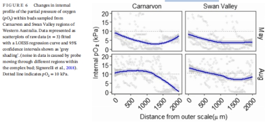 休眠期(5月) 兩地芽核心pO?均≤5 kPa(圖6a, b) 證實休眠期芽內普遍缺氧,支持“缺氧維持休眠”理論(Meitha et al. 2018)。