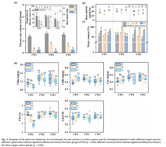 根系泌氧速率(ROL) 圖2c A組ROL顯著提高(1.53–2.56 mg/(h·plant)),揭示根系形態(tài)驅(qū)動(dòng)泌氧能力。