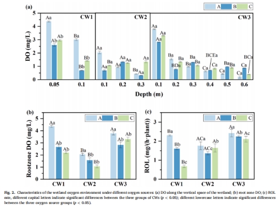 氧環(huán)境提升:僅依賴POR時(shí)(A組),根區(qū)DO達(dá)2.05–4.37 mg/L(圖2b),顯著高于其他組(p<0.05)。