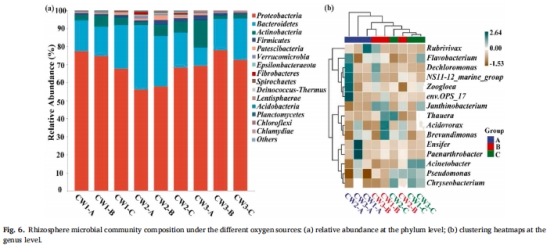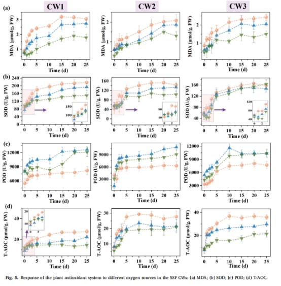 根區(qū)DO提升 A組DO達(dá)4.37 mg/L(圖2b) 證實(shí)僅憑POR即可滿足好氧微生物需求(>1.5 mg/L),推翻“外源氧必需”傳統(tǒng)認(rèn)知。