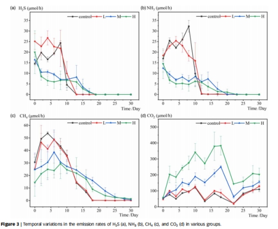 數(shù)據(jù):H?S、NH?、CH?排放↓(最高降幅70%),CO?排放↑(10V組達243.9 μmol·h?1)。