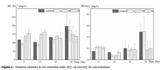 數(shù)據(jù):SO?2?濃度波動(電壓抑制硫酸鹽還原),NO??濃度在低氧組(M/H)↓(因硝酸鹽還原增強)。