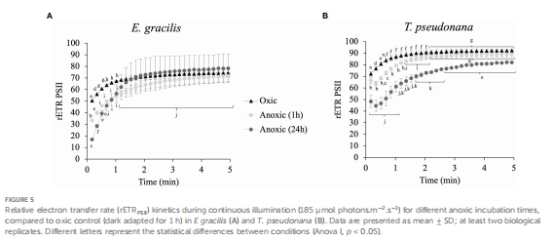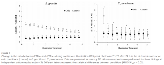 在黑暗缺氧條件下培養(yǎng)后,兩種藻類(lèi)均能恢復(fù)光合線性電子傳遞(LEF),并表現(xiàn)出短暫的 PSI環(huán)式電子流(CEF) 激活(圖1, 圖7)。