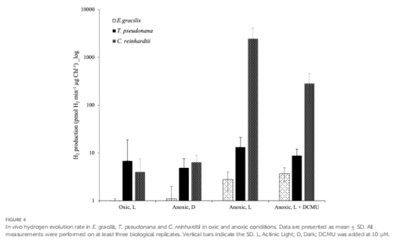 在萊茵衣藻中,缺氧光照下H?釋放速率可達(dá) 2 nmol·min?1·μg chl?1(圖4),而兩種目標(biāo)藻類(lèi)僅 5 pmol·min?1·μg chl?1(背景水平)。這一數(shù)據(jù)直接否定了氫酶在二者光合恢復(fù)中的核心作用。