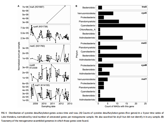 宏基因分布 圖5 證明降解基因在湖泊中廣泛存在(如cysK豐度最高),提示生態普遍性。