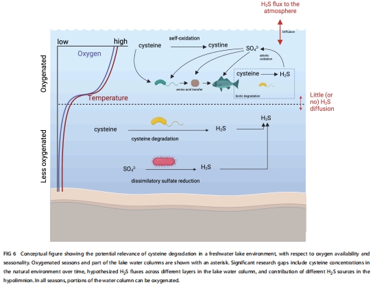 論文揭示了淡水湖泊富氧環境中細菌通過降解半胱氨酸(Cysteine)產生硫化氫(H?S)的現象。傳統認為H?S主要源于缺氧環境的硫酸鹽還原,但本研究證明多種細菌(如變形菌門、擬桿菌門)可在有氧條件下通過降解半胱氨酸釋放H?S,拓展了對硫循環的認知。