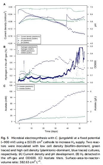 浮游生長 更高效:醋酸鹽產(chǎn)量(6.06 g L?1)和CE(87.4%)遠(yuǎn)超生物膜生長(圖5),因H?擴(kuò)散利用率更高。