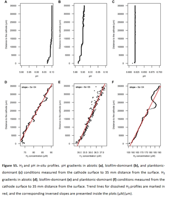 H?濃度梯度 Unisense H?微傳感器(圖S5) 證實(shí)陰極附近溶解H?濃度 > 0.6 mM,支持 H?介導(dǎo)的電子傳遞(MET)主導(dǎo)。