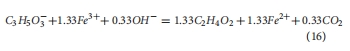 Fe(III):乳酸比 Ferrozine法 確定厭氧代謝化學計量比(1.46±0.15),修正傳統(tǒng)模型(式21)的預測偏差 結果3.3節(jié), 式16