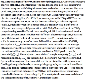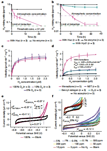 超高親和力:Huc的Km=129 nM,可氧化低至31 pM的H?(圖1a,d),遠(yuǎn)超傳統(tǒng)氫酶(Km>500 nM)。