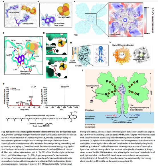 甲萘醌(E°=-74 mV)為最佳電子受體(圖1d),支持Huc-MQ直接偶聯(lián)模型(圖4i)。