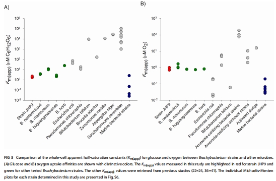 氧/葡萄糖親和力Km(app) 圖5 超高氧親和力(Km=0.73–1.22 μM)和葡萄糖親和力(Km=0.73–1.22 μM),適應低營養(yǎng)環(huán)境。
