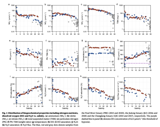 研究通過氮同位素標(biāo)記實驗,發(fā)現(xiàn)富營養(yǎng)化、高濁度的中國沿海水域(長江口、九龍江口、珠江口)是N2O排放熱點(diǎn)。與傳統(tǒng)認(rèn)知相反,在含氧水域中,反硝化作用(而非氨氧化)是N2O的主要來源(貢獻(xiàn)率>50%)。粒徑分級實驗和基因分析表明: