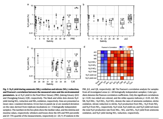 數(shù)據(jù):反硝化路徑貢獻(xiàn)N2O比例(珠江口51%、九龍江口64%、長江口70%)