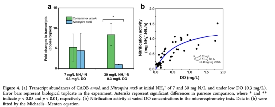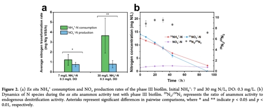 DO調控(圖4b, 圖7a):Unisense微呼吸儀顯示DO=0.3 mg/L時AnAOB活性峰值(0.08 mg N/gVSS/h),CAOB硝化活性隨DO升高(KO=0.62 mg/L)。