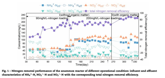 長期實驗:運行336天序批式反應(yīng)器(SBR),分兩階段(無sCOD vs. sCOD/N=0.5),監(jiān)測氮素去除動態(tài)(圖1)