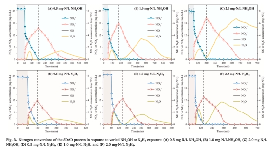 測試不同濃度NH?OH(0.5-2.0 mg-N/L)和N?H?(0.5-2.0 mg-N/L)對SDAD的影響;