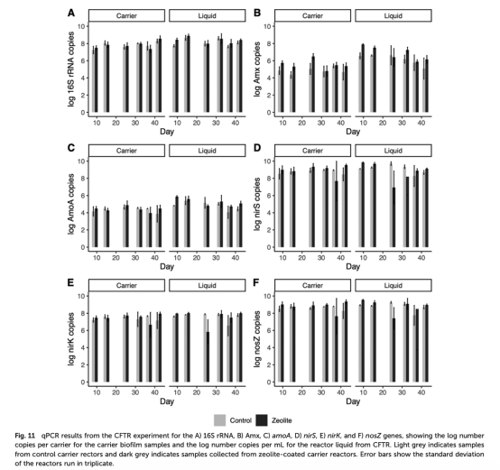 數據:厭氧反應器中,沸石載體上的Anammox基因(Amx)拷貝數高1-2個數量級,nirS/nosZ基因顯著富集(P<0.05)。