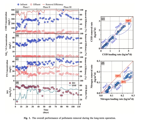 通過構(gòu)建實驗室規(guī)模RSABR系統(tǒng)(工作體積7L,填充率45%的高密度聚乙烯懸浮載體),采用合成廢水進行三個階段實驗(階段I-III),逐步增加有機負荷率(OLR)和水力停留時間(HRT)。監(jiān)測水質(zhì)參數(shù)(COD、NH4-N、TN等)、溶解氧分布、氣體排放;進行典型周期實驗和批處理實驗分析動力學;通過呼吸測試量化活性生物量;利用高通量測序和宏基因組學揭示微生物群落結(jié)構(gòu)及氮代謝途徑。