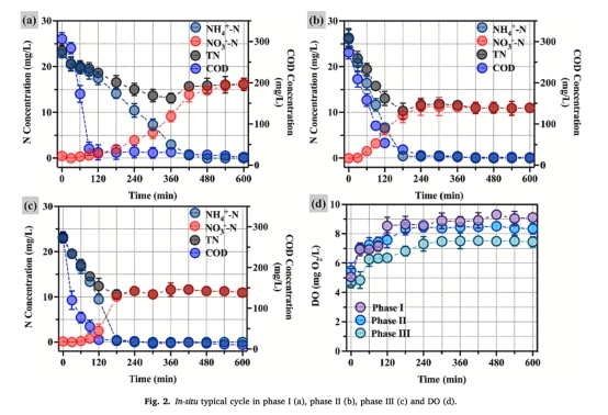 典型周期實驗數(shù)據(jù):包括污染物濃度隨時間變化(如NH4-N、TN)和DO動態(tài)。來源:圖2a-c和圖2d。研究意義:揭示系統(tǒng)在短時間內(nèi)的去除動力學(如TN在180分鐘內(nèi)快速下降),證明SND過程的發(fā)生(NO3-N生成量低于NH4-N消耗量),并確認旋轉(zhuǎn)設計實現(xiàn)穩(wěn)定DO環(huán)境(6-9 mg/L),支持無需外部曝氣的運行模式。