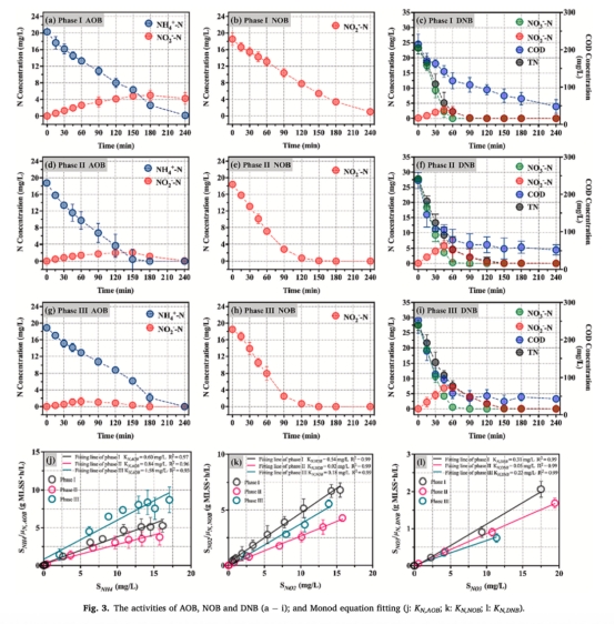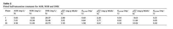 微生物動力學數(shù)據(jù):包括氨氧化速率(AOR)、亞硝酸鹽氧化速率(NOR)、反硝化速率(DNR)及Monod動力學參數(shù)(如KN,AOB)。來源:圖3和表2。研究意義:量化功能菌活性(如DNB速率高達42.73 mg/L/h),解釋生物膜內(nèi)擴散阻力變化(KN,AOB上升),并關聯(lián)系統(tǒng)脫氮效率提升(如μmaxNO3增加至15.02 mg/g MLSS/h),為優(yōu)化生物膜載體設計提供依據(jù)。