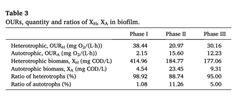 活性生物量數(shù)據(jù):包括異養(yǎng)生物量(XH)和自養(yǎng)生物量(XA)比例及氧攝取率(OUR)。來源:表3。研究意義:量化生物膜中功能菌群分布(如XA占比最高11.26%),說明高異養(yǎng)生物主導碳代謝,而自養(yǎng)生物增長支撐硝化性能,反映系統(tǒng)對負荷變化的適應性。