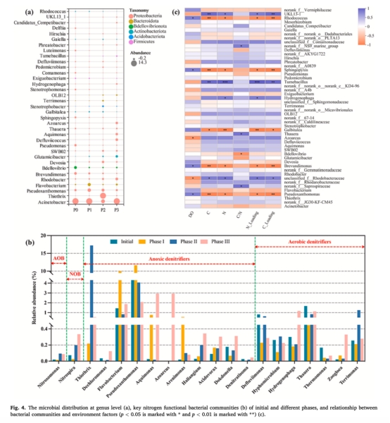 微生物群落數(shù)據(jù):包括優(yōu)勢菌門(如Proteobacteria)及關鍵氮功能菌(如Thiothrix、Hydrogenophaga)豐度。來源:圖4a-b。研究意義:揭示SND的微生物機制(如缺氧反硝化菌富集至23.48%),并關聯(lián)環(huán)境因子(如DO與Pseudoxanthomonas正相關),解釋系統(tǒng)在好氧條件下實現(xiàn)反硝化的原因。