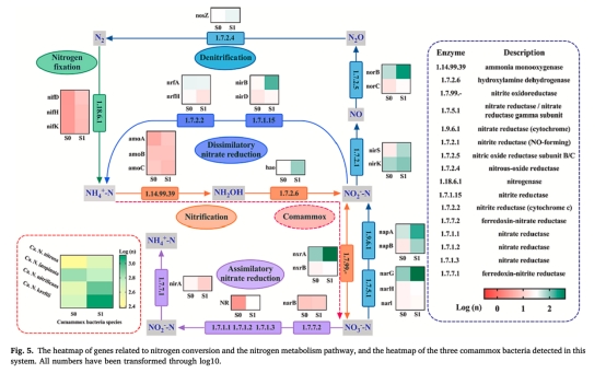 氮代謝途徑數(shù)據(jù):包括氮轉(zhuǎn)化基因(如amoABC、nirSK)和comammox菌(如Ca. N. nitrosa)豐度。來源:圖5。研究意義:通過宏基因組分析確認反硝化為主導途徑(基因豐度高于初始兩倍),并發(fā)現(xiàn)comammox菌貢獻硝化效率,為SND的整合機制提供分子證據(jù)。