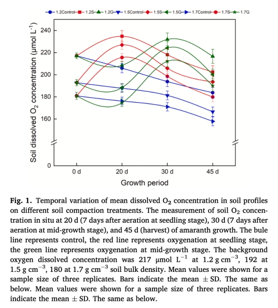 數(shù)據(jù):Unisense微電極原位監(jiān)測顯示,生長期增氧使1.5 g cm?3土壤氧濃度從166升至199 μmol L?1。
