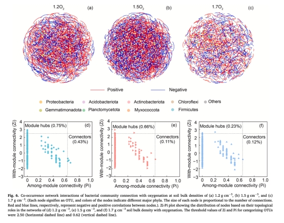微生物群落:增氧增加土壤細菌多樣性(圖5d),富集溶磷菌(Firmicutes和Proteobacteria,圖5a),并在中度板結土壤(1.5 g cm?3)中構建更穩(wěn)定的微生物共現(xiàn)網(wǎng)絡(圖6,表3)。