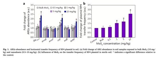 研究揭示了二硫化鉬(MoS?)納米片通過(guò)促進(jìn)細(xì)菌間質(zhì)粒水平轉(zhuǎn)移,增加土壤中抗生素抗性基因(ARGs)的豐度。關(guān)鍵發(fā)現(xiàn)包括:
