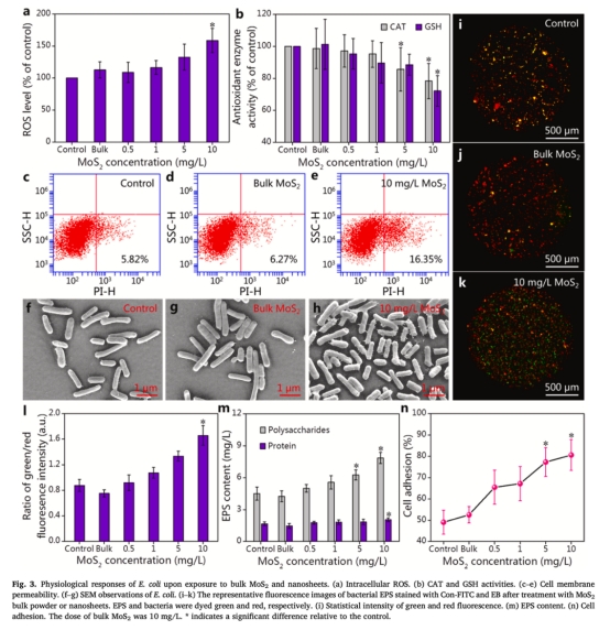 質(zhì)粒轉(zhuǎn)移機(jī)制:MoS?納米片劑量依賴(lài)性地加速RP4質(zhì)粒在E. coli間的水平轉(zhuǎn)移頻率(10 mg/L時(shí)達(dá)對(duì)照的2.07倍),而塊體MoS?無(wú)此效應(yīng)(圖1b, 圖2a)。