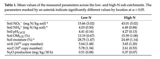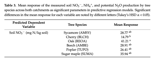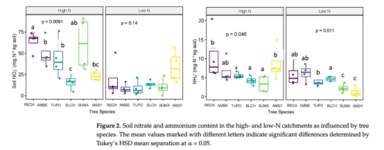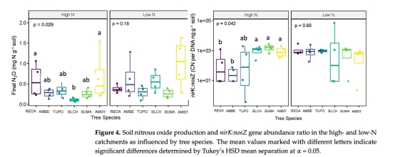 數(shù)據(jù):高氮子流域中,美國(guó)梧桐土壤N?O產(chǎn)量最高(0.83 mg N/kg),糖楓最低(0.26 mg N/kg)。