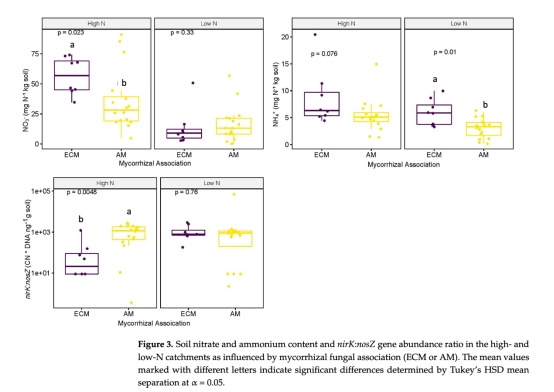 研究探討了六種樹種(包括ECM菌根關(guān)聯(lián)的北美紅櫟、美洲山毛櫸和AM菌根關(guān)聯(lián)的糖楓、美國(guó)梧桐等)在兩種氮輸入水平(高氮與低氮子流域)的河岸土壤中,對(duì)硝酸鹽(NO??)和一氧化二氮(N?O)產(chǎn)生的影響。關(guān)鍵發(fā)現(xiàn)包括: