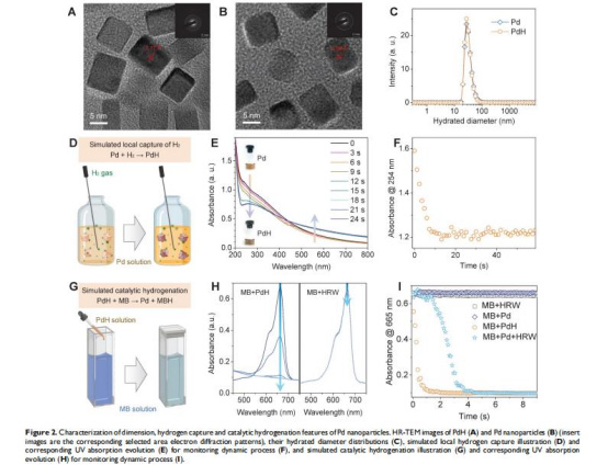 材料設計:合成30 nm水合粒徑的立方體Pd NPs(圖2A-C),驗證其捕氫(圖2D-F)和催化氫化能力(圖2G-I)。