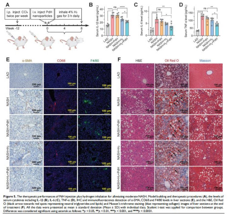輕度NASH預防:PdH注射 + 每日H?吸入(16周),改善血脂(圖4B-C)、炎癥(圖4D-F)及脂肪變性(圖4G)。